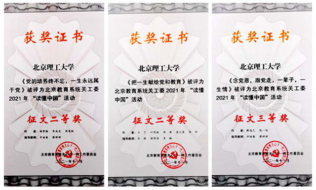 在北京教育系统关工委2021年“读懂中国”活动中,我校共有征文类、微视频类、短视频类12个作品获奖。学校关工委荣获北京教育系统关工委2021年“读懂中国”活动优秀组织奖。