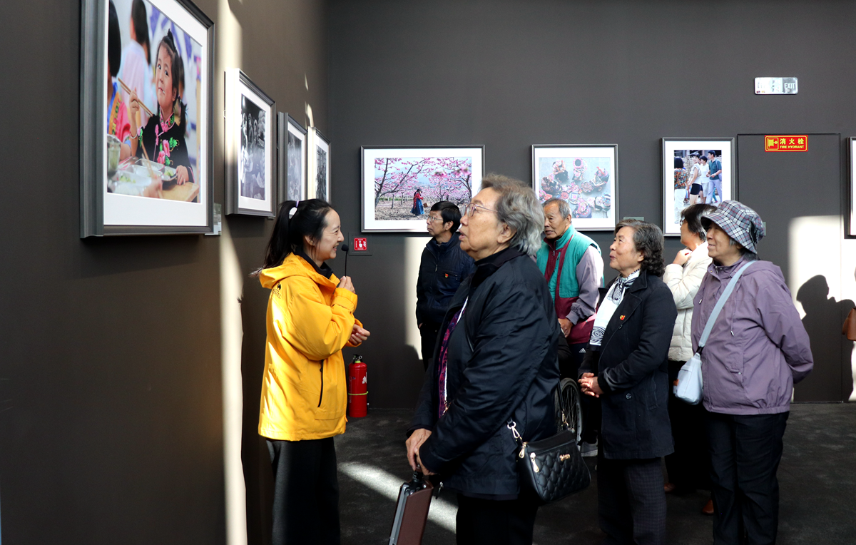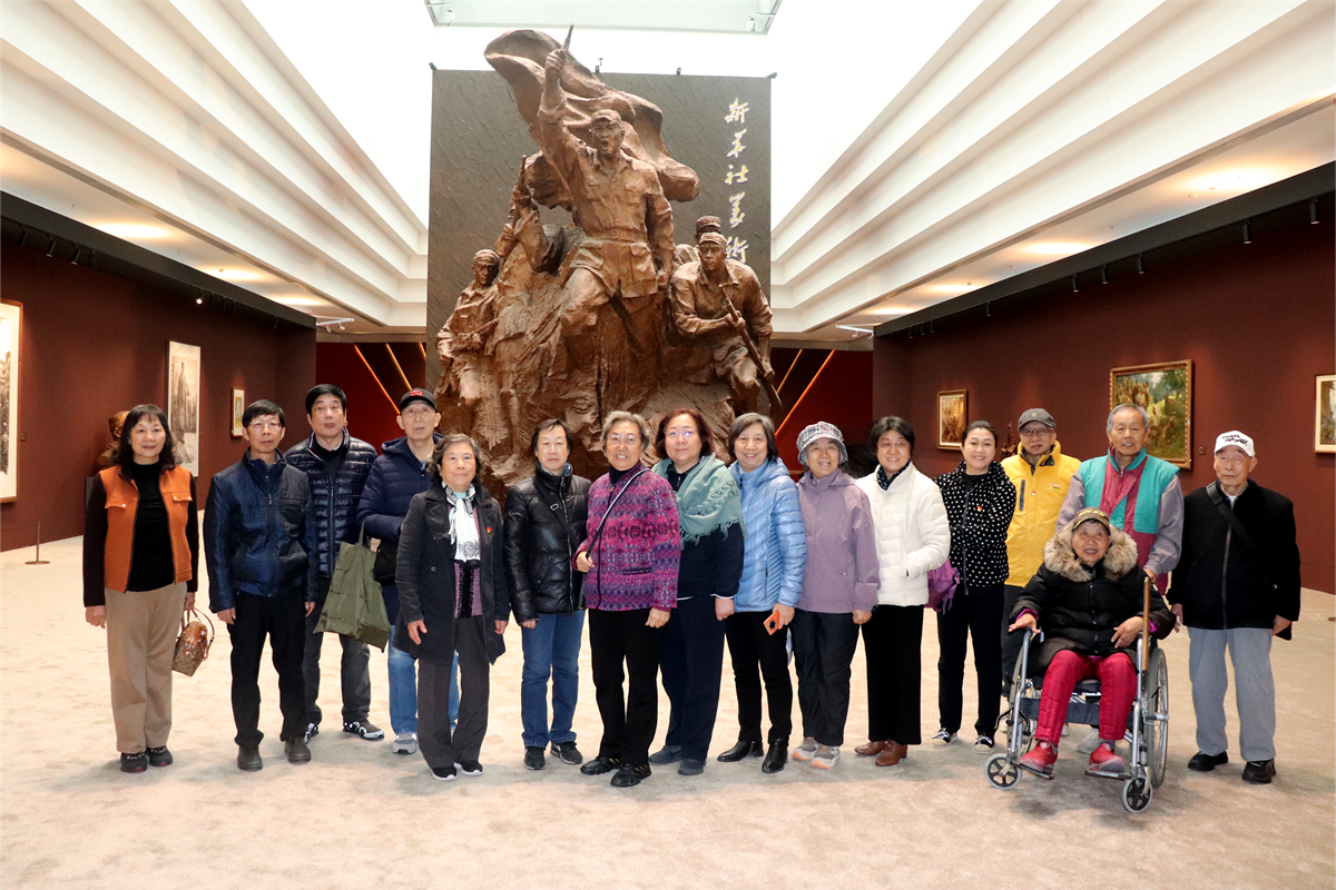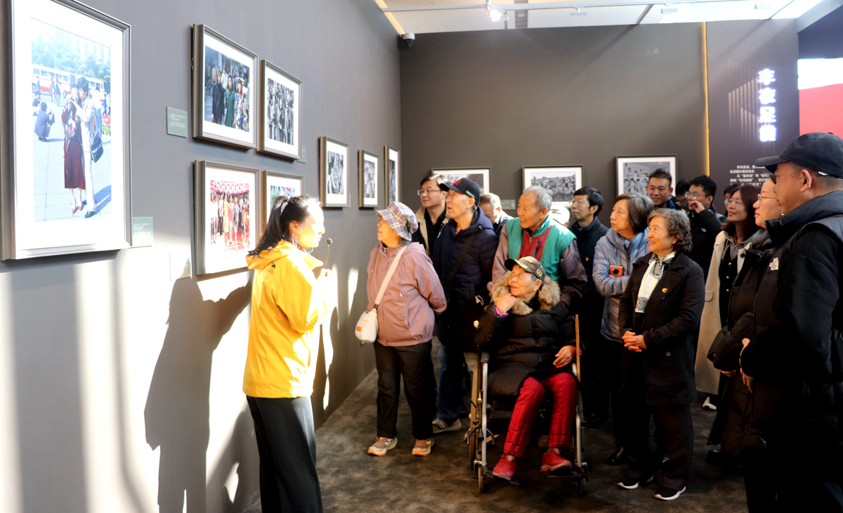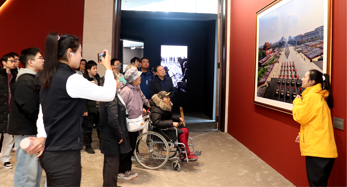 大家首先参观了由新华通讯社主办,新华社美术馆、新华社投资控股有限公司、新华社中国图片社承办的“国社之镜·世纪光影之人民必胜”艺术展。展览通过140余张珍贵历史照片、抗战文物和十余件著名艺术家的绘画及雕塑作品,全景再现中国作为世界反法西斯战争东方主战场的壮烈史诗。透过一幅幅珍贵的历史照片,老党员们结合自身阅历,为学生们生动讲述了照片所处年代的历史故事,分享了砥砺奋斗、军工报国的体会。