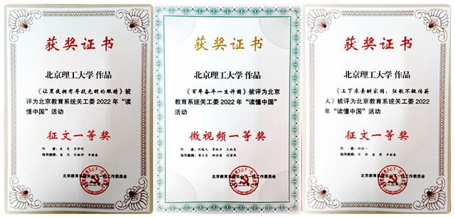 荣获教育部关工委奖项2个,北京教育系统关工委奖项9个,光电学院周立伟院士的事迹征文《让黑夜拥有寻找光明的眼睛》荣获教育部关工委最佳征文奖,机械与车辆学院吴大昌教授事迹微视频《百年奋斗一生许国》荣获教育部关工委优秀微视频奖,学校关工委获受表扬单位。