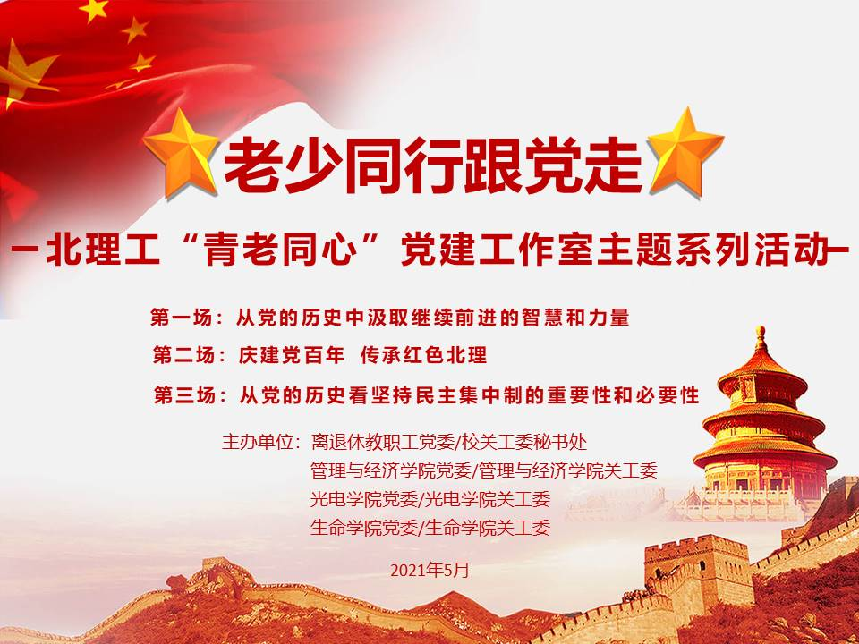 为扎实推进党史学习教育,传承百年大党红色基因,弘扬老一辈北理工人的光荣传统,进一步增强大学生爱党爱国爱校情怀,营造蓬勃向上、团结奋进的校园氛围,离退休党委联合管理学院党委、光电学院党委、生命学院党委,依托离退休党委“青老同心”党建工作室,共同开展了“百年党史催奋进 红色北理育新人”——“老少同行跟党走”之党史共学共话系列活动。活动共分三场:第一场,邀请宇航学院退休老教授、校关工委党建项目组负责人李兆民主讲《从党的历史中汲取继续前进的智慧和力量》党史课;第二场,邀请学校党史学习教育宣讲团成员、校关工委委员张敬袖以《庆建党百年 传承红色北理》为主题进行校史讲座;第三场,邀请学校党史学习教育宣讲团成员、退休10-2党支部书记徐其敏讲授《从党的历史看坚持民主集中制的重要性和必要性》主题党课。离退休党委书记蔡婷婷,离退休党委副书记、离退休处副处长李振江参加活动。